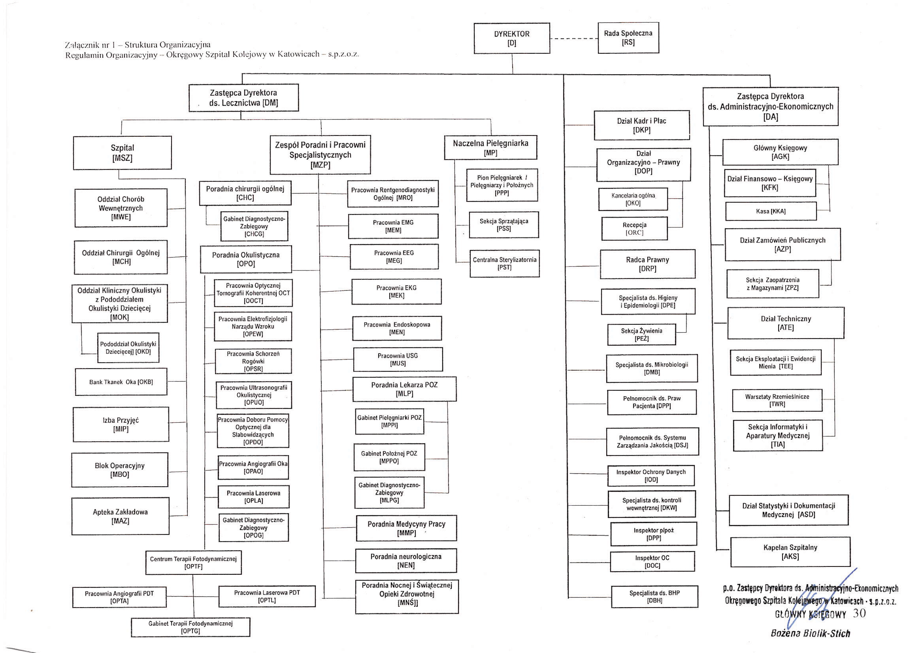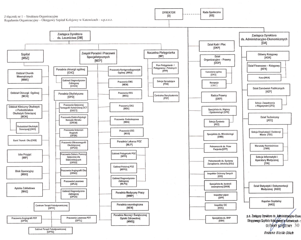 Aktualny schemat organizacyjny Okręgowego Szpitala Kolejowego w Katowicach wszedł w życie z dniem 22 marca 2022 roku, będąc pozytywnie zaopiniowany przez Radę Społeczną Szpitala. Aby wyświetlić schemat w powiększeniu kliknij w znajdujący się poniżej obraz, lub pobierz dokument w PDF